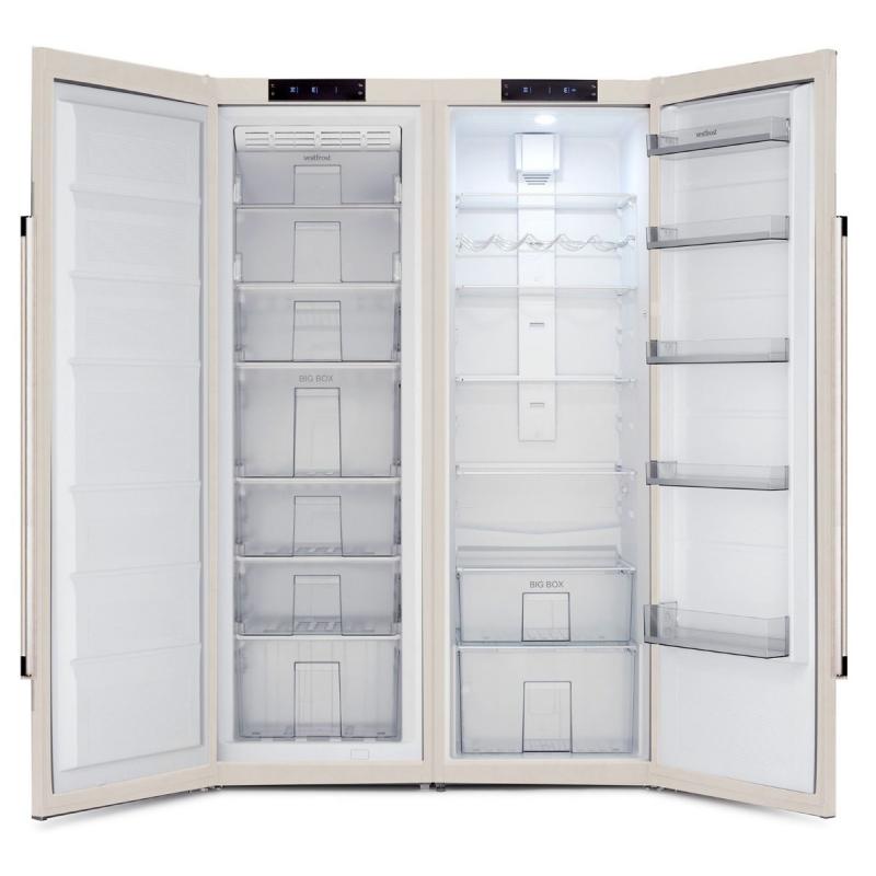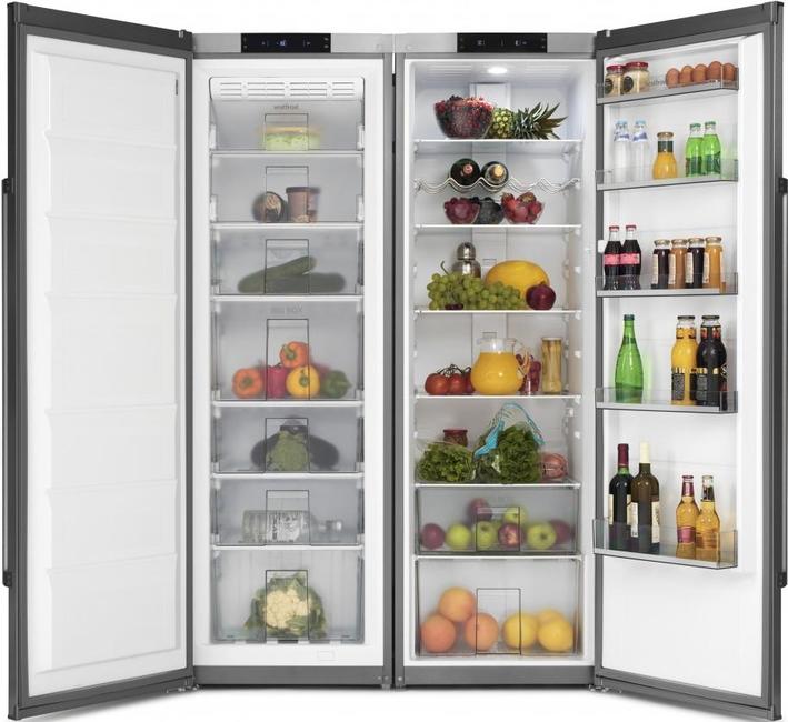 Un modèle intéressant d'un fabricant allemand, composé de deux blocs séparés - un congélateur et un réfrigérateur, grâce auxquels il est facile de l'amener dans le salon. Peut être utilisé individuellement. C'est l'un des modèles côte à côte les plus spacieux en principe, son volume est de 690 litres à une hauteur de 185 cm.De haute qualité et soigneusement assemblé - ouvrir la porte en appuyant sur la poignée maintient le joint intact. Pour que les produits dans le congélateur ne se détériorent pas plus longtemps, après la fermeture de la porte, le processus d'aspiration de l'air entrant a lieu. À ce stade, n'essayez pas de l'ouvrir. Le réfrigérateur appartient à la classe énergétique A +, il a une indication de porte ouverte et une augmentation de la température. La fonctionnalité comprend la super-congélation et la super-refroidissement.
