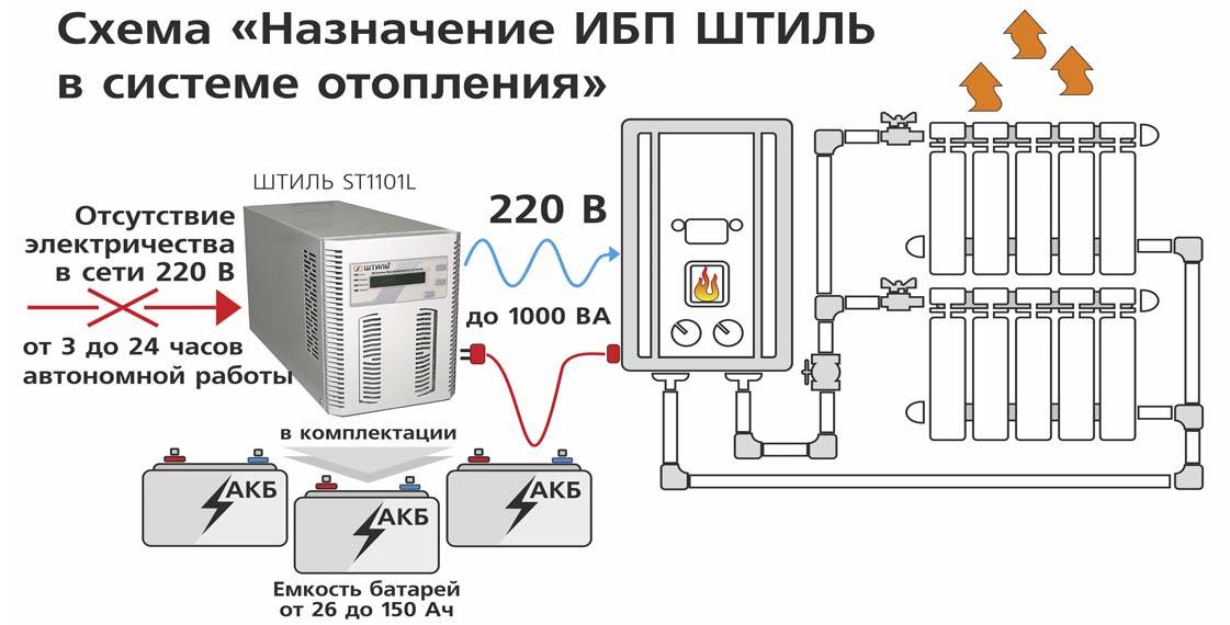 Capacité de la batterie détermine le temps pendant lequel la pompe du système de chauffage fonctionnera en l'absence de réseau. Les batteries intégrées à l'onduleur ont généralement une petite capacité, déterminée principalement par la taille de l'appareil. Si la source d'alimentation de secours doit fonctionner dans des conditions de pannes de courant fréquentes et prolongées, vous devez choisir des modèles qui permettent connecter des batteries externes supplémentaires.