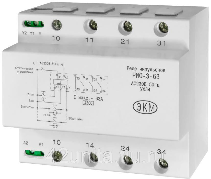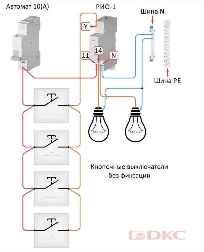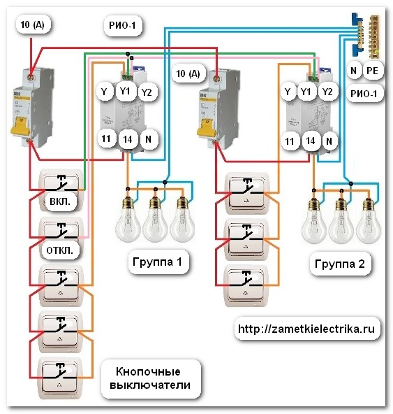 L'appareil bipolaire n'a pas de protection de courant, alors installez-le avec le disjoncteur. Avec une forte charge d'éclairage, les lampes sont connectées via un démarreur magnétique. Les relais à impulsions ont peur des vibrations, ils ne sont donc pas installés à côté des démarreurs électromagnétiques. La charge est connectée via les broches 11-14. Appuyez sur le commutateur Y pour allumer la lumière et appuyez à nouveau pour l'éteindre.