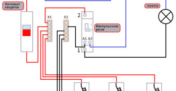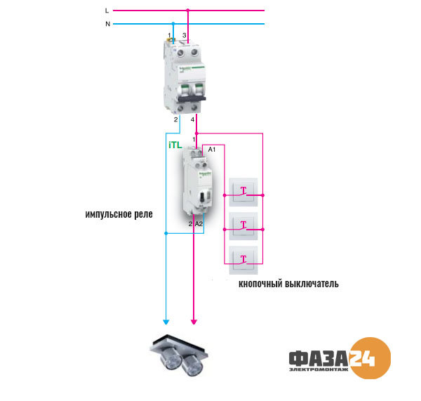 Schéma n ° 1 Veuillez noter que dans un relais à impulsions, la charge ne passe pas du tout par le bouton. En appuyant dessus, vous donnez juste une impulsion à la bobine, qui ferme le contact de puissance