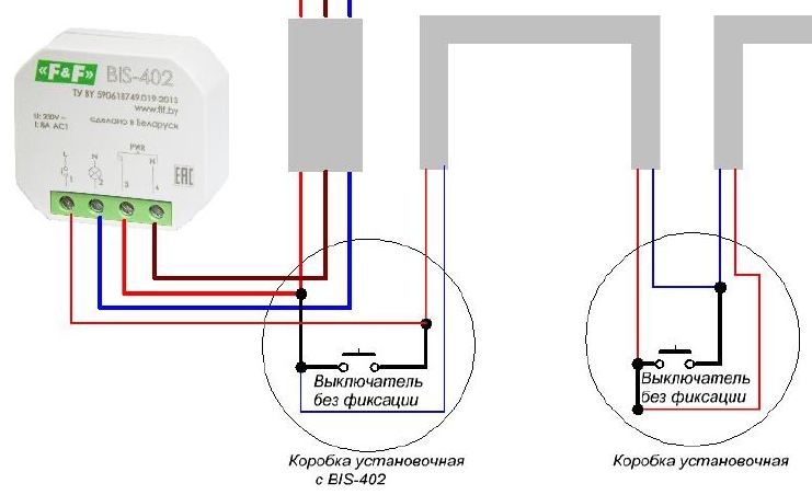 Le fil neutre vers les lampes d'éclairage est fourni séparément.Le nombre d'interrupteurs connectés à l'appareil n'est pas supérieur à celui indiqué dans le passeport, avec un plus grand nombre d'interrupteurs, une fausse opération est possible. Le dispositif comprend une unité de commande électronique pour un relais polarisé avec une bobine électromagnétique. La tension d'alimentation du relais peut provenir du secteur, DC 12 V ou AC 24 V.