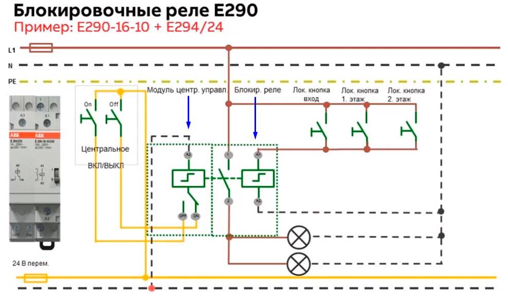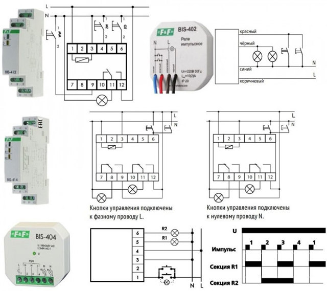 Des minuteries peuvent être intégrées au relais, qui allument l'éclairage à une heure prédéterminée. Le schéma de connexion du télérupteur comporte quatre types de commutation. Une sortie est destinée à la phase de la tension d'alimentation, la seconde est connectée au zéro de travail, la sortie pour connecter les boutons et commuter la phase via des contacts pour connecter l'éclairage.