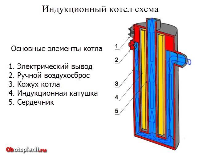 La conception de la chaudière est basée sur des inducteurs électriques, ils comprennent 2 enroulements en court-circuit. L'enroulement interne transforme l'énergie électrique entrante en courants de Foucault. Au milieu de l'unité, un champ électrique apparaît, qui pénètre alors dans la deuxième bobine.