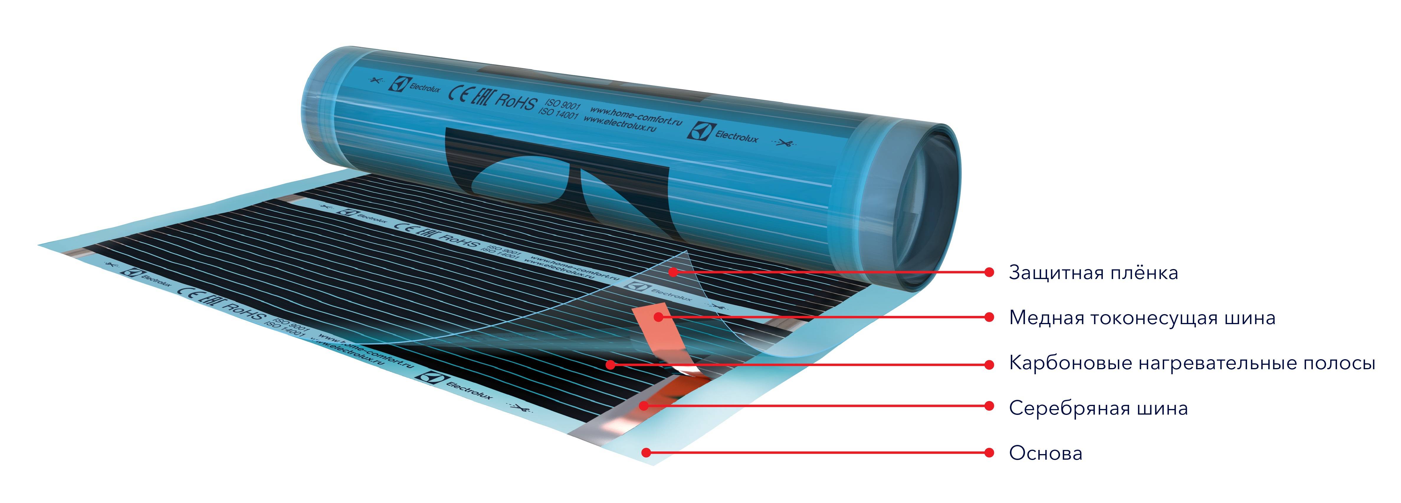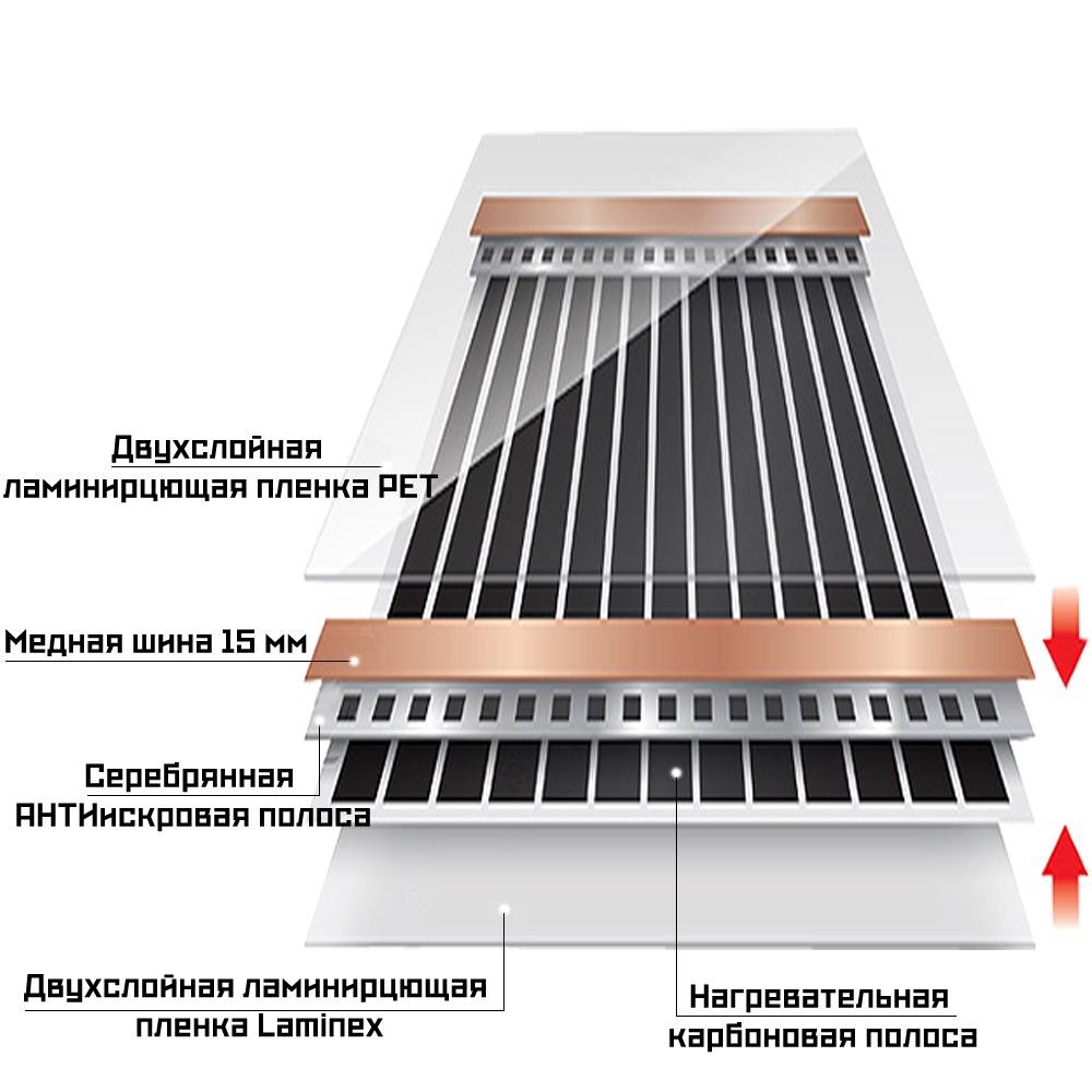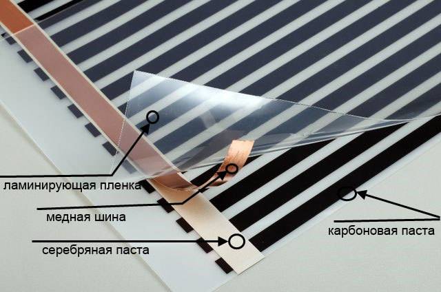 Nous parlons d'un produit très fin : l'épaisseur du film ne dépasse pas 0,22-0,4 mm. La toile se compose de cinq couches : une base intérieure et extérieure en matériau polymère à haute résistance et trois couches intérieures. Un matériau non tissé spécial est utilisé pour séparer le plastique de l'élément chauffant. Au milieu se trouve l'élément chauffant lui-même, composé de pistes de cuivre (pneus) et de bandes de carbone (fibre de carbone). Ce matériau composite contient des polymères et des fibres de carbone.