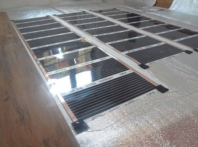Lorsqu'il est correctement installé, le film de chauffage par le sol est absolument sans danger. Si les bornes sont connectées, serties et isolées correctement, le risque de court-circuit est minime. Le chauffage des éléments en carbone eux-mêmes n'est effectué que jusqu'à 30–45 0С, jusqu'à un maximum de 60 0С. Ils ne sont pas capables de fondre ou de mettre le feu à quoi que ce soit.