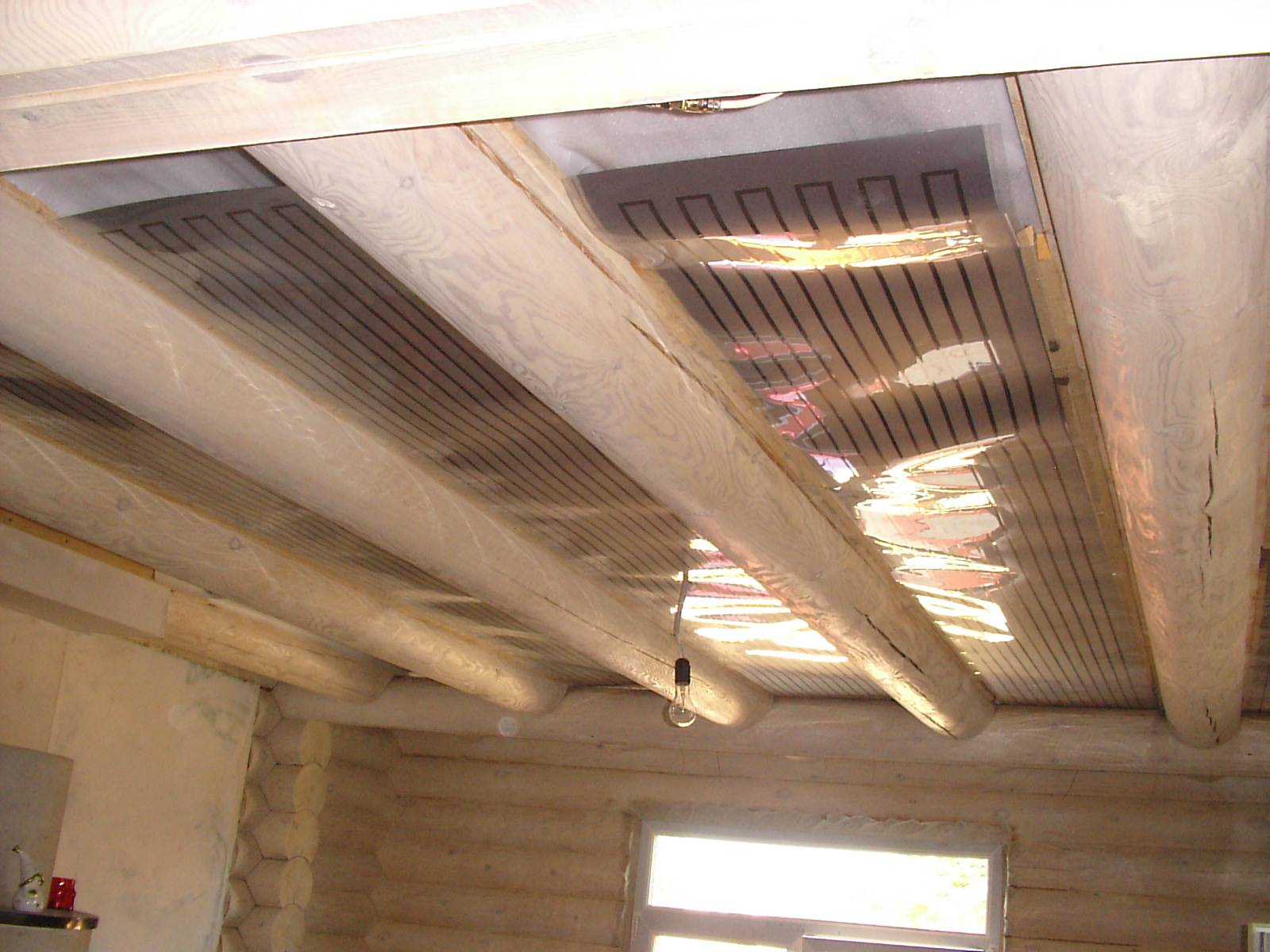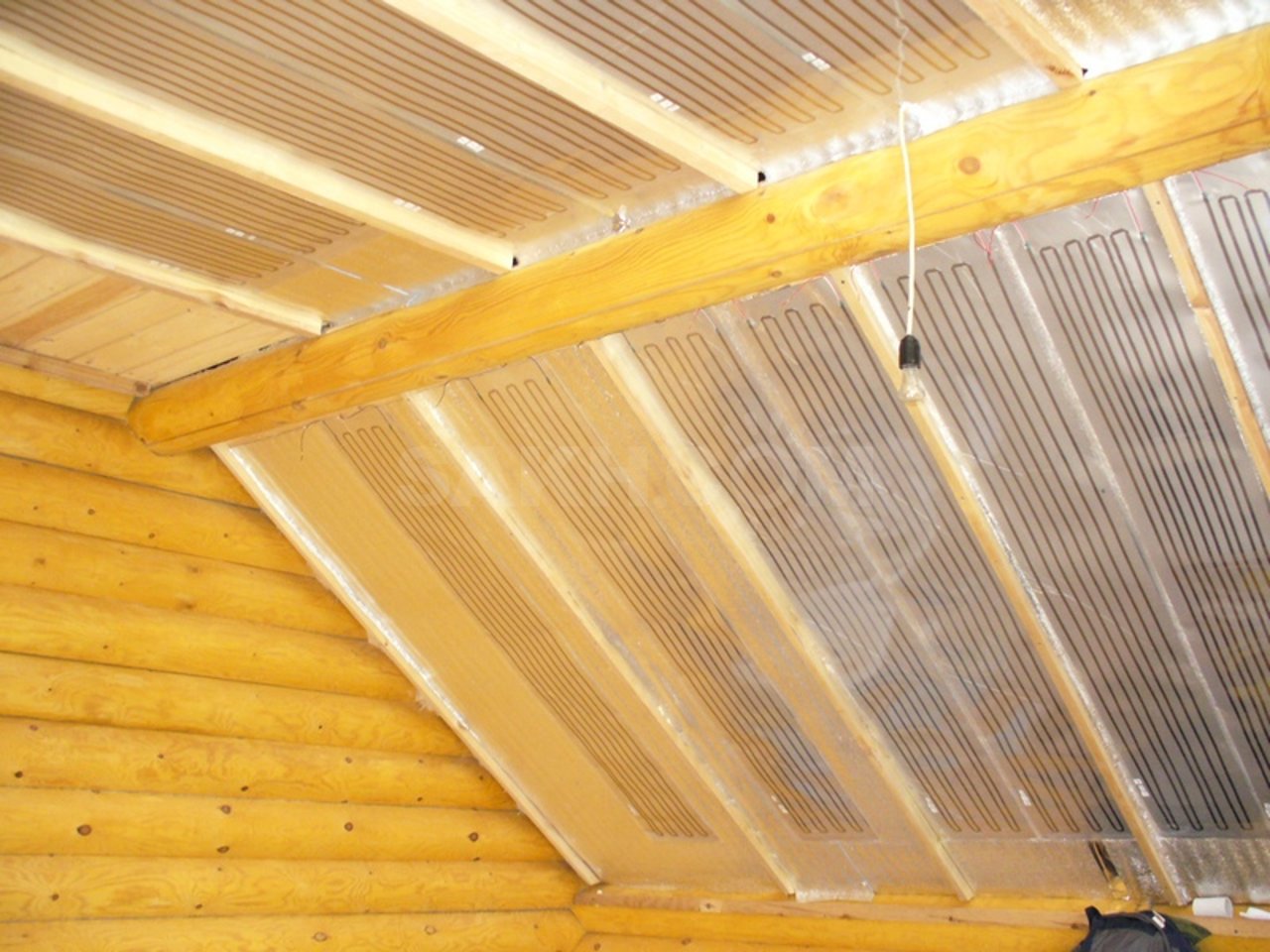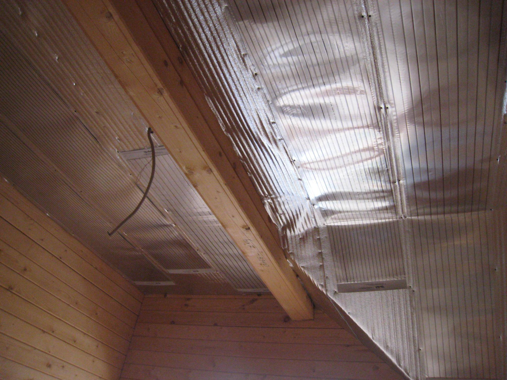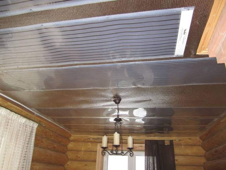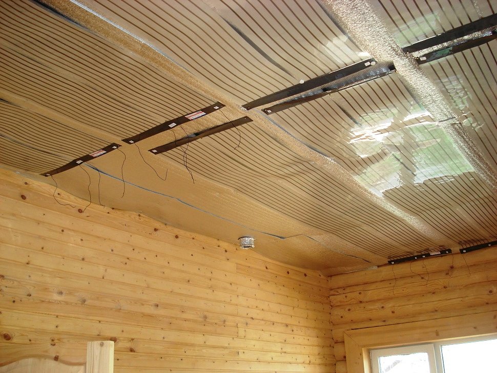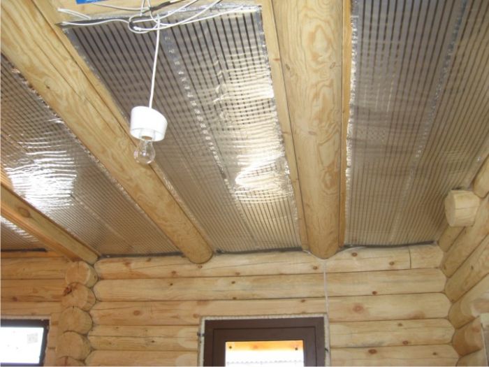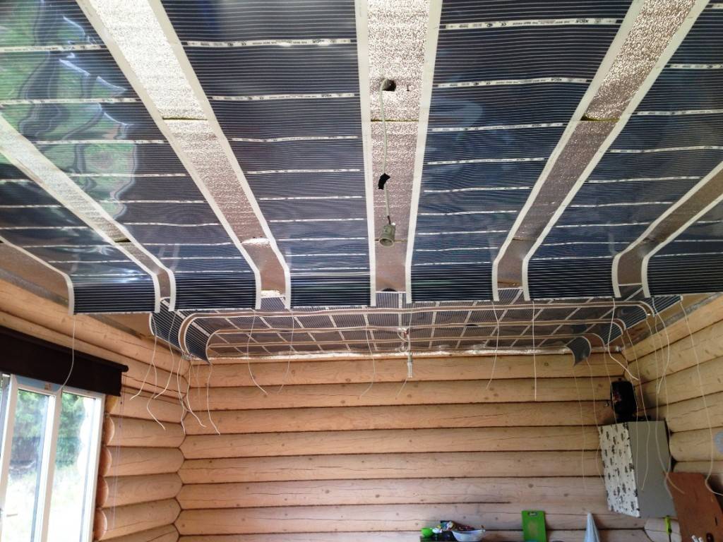 En plus de la lampe au plafond, vous pouvez placer un radiateur infrarouge à film. Cette invention vraiment révolutionnaire consiste en deux couches de film polymère, entre lesquelles se trouvent des traces de pâte de carbone. Elle joue le rôle d'un émetteur IR. Le radiateur lui-même ressemble à une feuille mince, qui est posée au plafond et vissée avec des chevilles ou des vis autotaraudeuses.