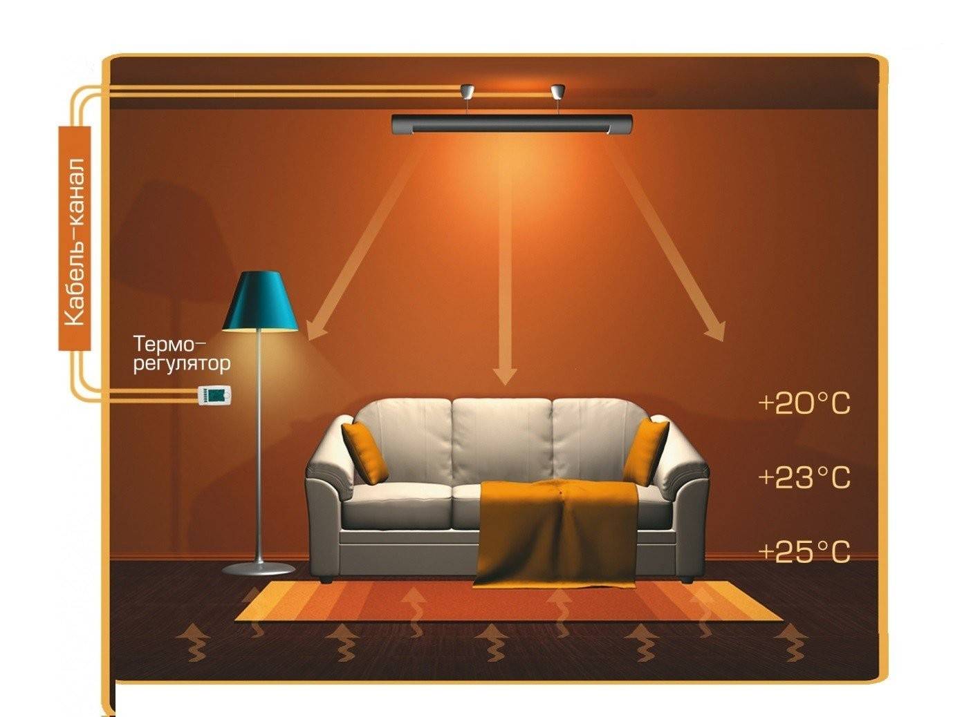 Il n'est pas recommandé d'installer des radiateurs infrarouges dans la zone de présence humaine constante (au-dessus du canapé, du lit, du bureau, dans la cuisine, dans le salon).