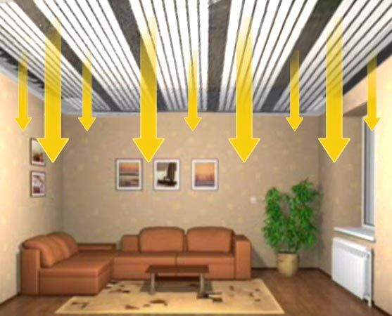 En conséquence, le radiateur infrarouge de plafond, ayant dépensé 1 kW d'électricité, dégage également environ 1 kW d'énergie thermique, mais cette énergie thermique est dirigée directement vers la partie de la pièce où elle est nécessaire, vers la partie inférieure.