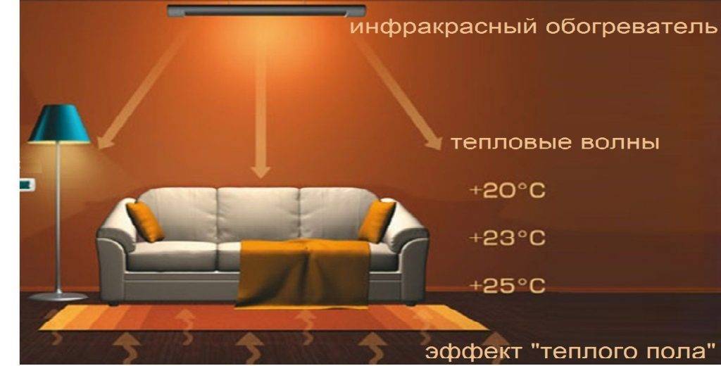 Le principe d'action du soleil a été pris comme base. Un radiateur infrarouge est installé au plafond ou en haut du mur. Il dirige les faisceaux vers le sol et les équipements de la pièce, qui chauffent et dégagent de la chaleur, chauffant l'ensemble du bâtiment. L'efficacité radiante (pourcentage d'électricité converti en chaleur) avec le chauffage infrarouge atteint 80 %.