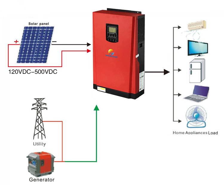 Le convertisseur hybride est connecté à la cellule photovoltaïque pour charger la batterie, et le réseau est combiné avec le module de batterie solaire principal.