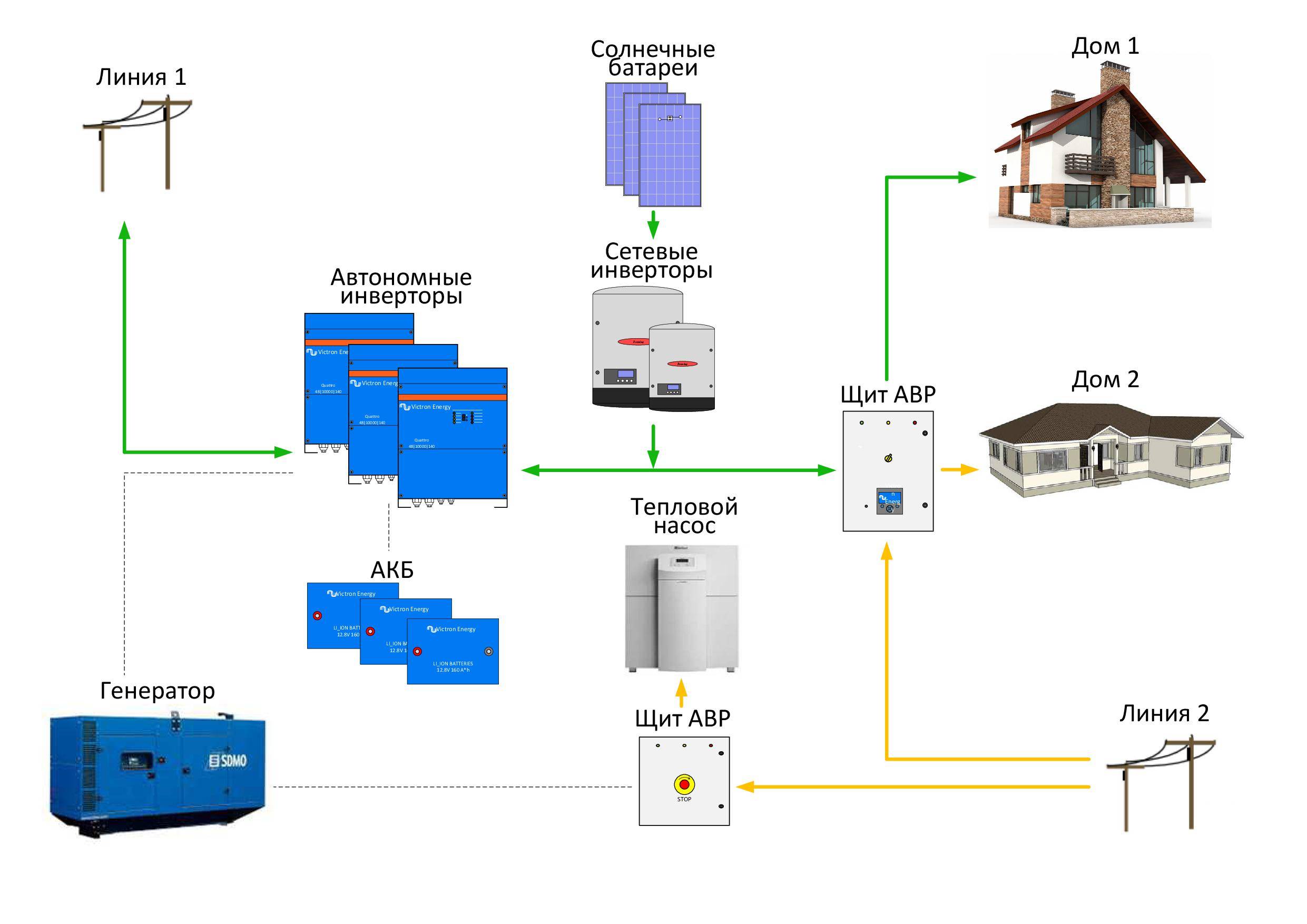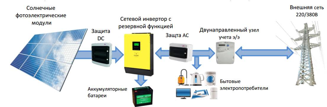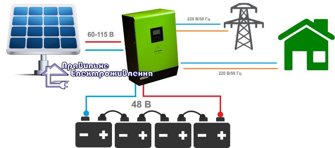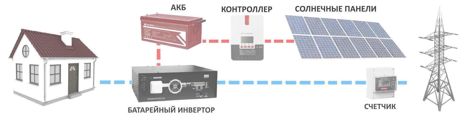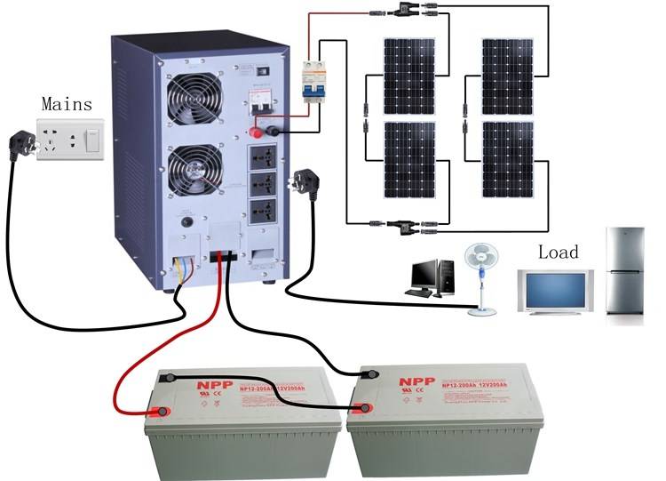 En tant que sources d'alimentation pour les onduleurs, des ensembles de batteries industrielles de grande capacité sont utilisés, à raison de plusieurs unités. Tous les équipements électroménagers y sont également connectés. Lorsque la tension du réseau central est coupée, tous les appareils électroménagers passent immédiatement à l'alimentation à partir de batteries. Lorsque l'alimentation principale est rétablie, l'onduleur passe automatiquement en mode de charge de la batterie et l'équipement domestique commence à fonctionner à partir du réseau central.Ainsi, l'alimentation électrique ininterrompue d'une maison privée est assurée.