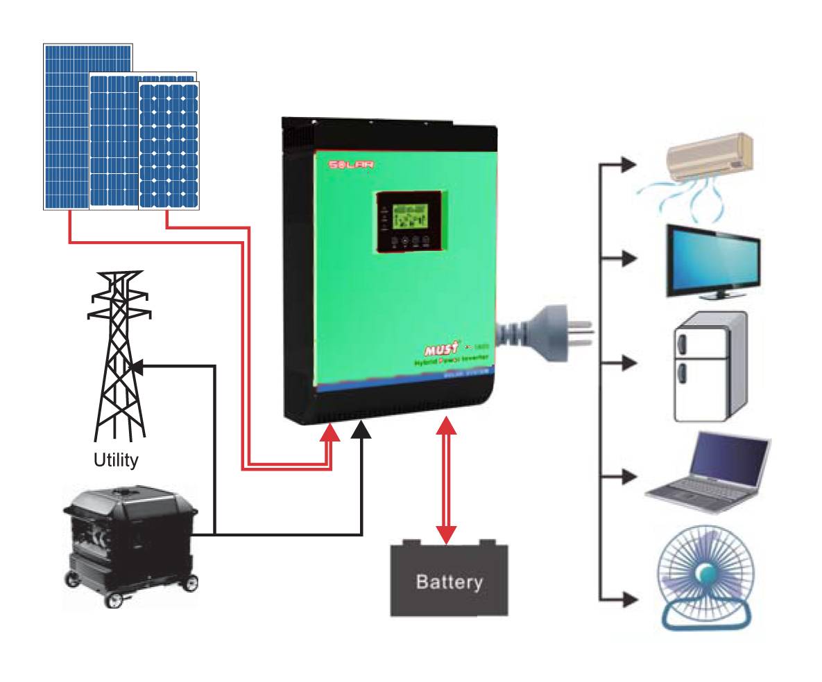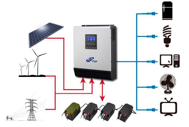 Tout d'abord, la batterie solaire agit comme un convertisseur de la lumière du soleil en courant électrique, puis le système de batterie est correctement chargé avec le courant et la tension correcte, cette charge est maintenue dans les batteries et, en connectant l'appareil onduleur, le courant continu est converti en courant alternatif.