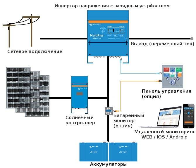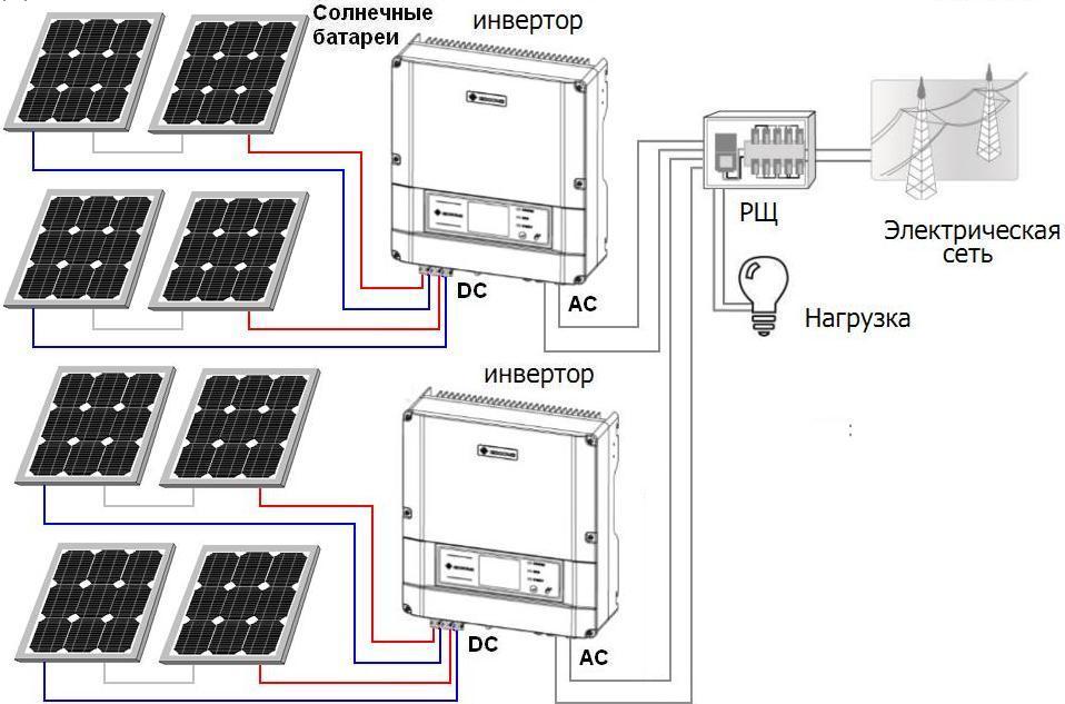 Ici, un convertisseur de type réseau est monté aux bornes de la batterie de l'onduleur. Dans ce cas, les deux convertisseurs sont connectés à des sources d'énergie solaire différentes.