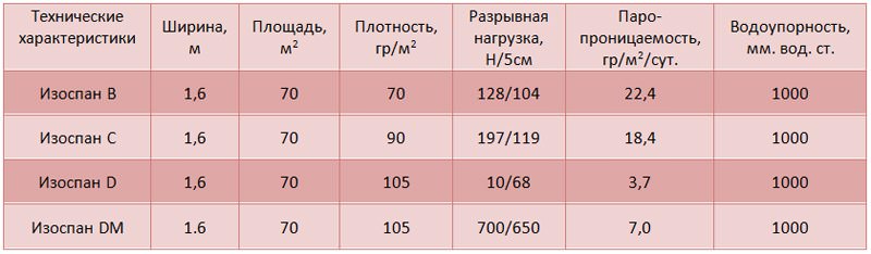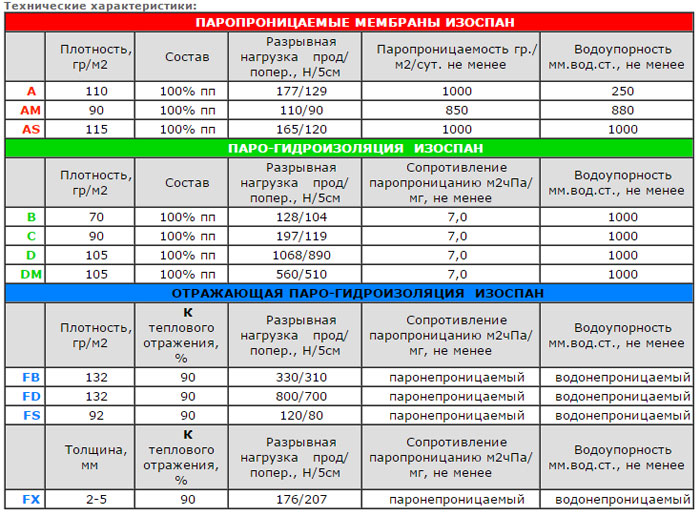 Au nom des matériaux, une lettre clé est apposée, par laquelle il est possible de déterminer le groupe et les propriétés de base. Donc Izospan A avec tous les autres indices désigne une membrane perméable à la vapeur. Izospan B, D, C - barrière hydro-vapeur. La différence entre les films de ce groupe et le premier est que ces matériaux (B, C, D) ne laissent pas passer la vapeur. Les matériaux du premier groupe (A) la conduisent (vapeur), et ne retiennent que l'eau. L'exception est la base Izospan A. Il ne retient pas l'eau et conduit la vapeur.