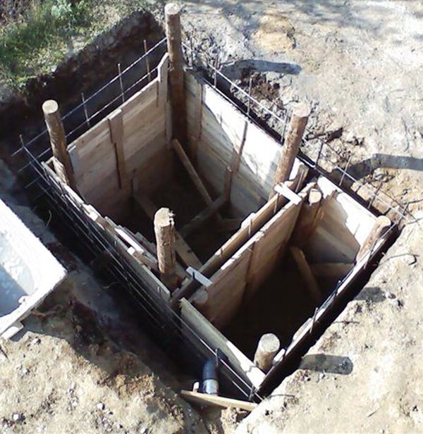- Dans la fosse excavée, le fond est nivelé et tassé, après quoi, sur le site d'installation de la première chambre, une solution pour la fondation est versée dans le coffrage.