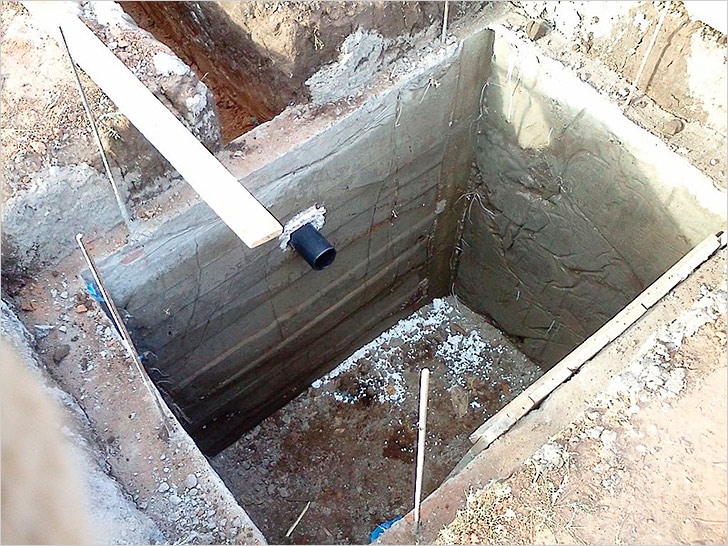 Si la structure est scellée, les drains ne doivent pas tomber dans le sol. Les murs de la structure sont généralement en brique, en anneaux de béton. La base est remplie de ciment. Pour que les drains se décomposent rapidement, des préparations biologiques sont introduites dans la fosse, mais de temps en temps, la fosse doit être pompée.