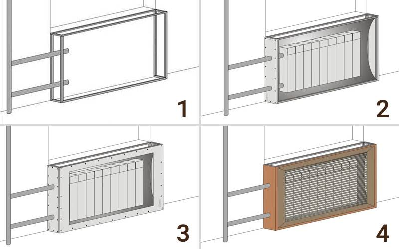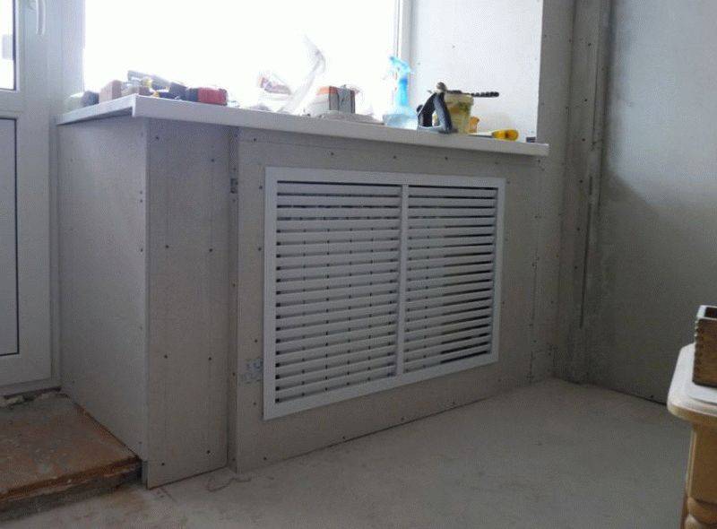 Lors de l'installation d'une boîte, la conception prend peu de place, couvrant un peu plus d'espace que le radiateur lui-même. La profondeur d'une telle boîte dépend de la largeur de l'appareil de chauffage (la plupart des radiateurs sont plus étroits que les radiateurs à plaques métalliques).