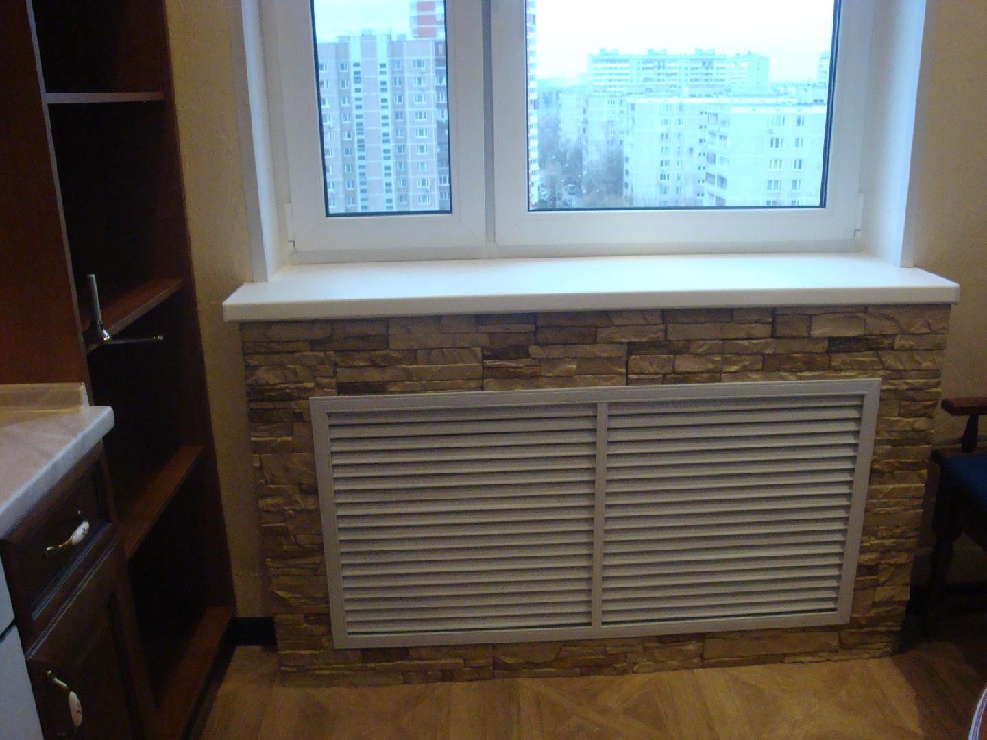 Il est nécessaire de fabriquer une boîte de cloison sèche qui couvrira toute la zone à problèmes du sol au rebord de la fenêtre des yeux. Cette solution au problème a un énorme avantage. De ce fait, il sera très beau, notamment grâce à la présence d'une grille zénithale, que je recommande d'assortir à la couleur du meuble. Les dimensions de la box dépendront de la batterie à dissimuler.