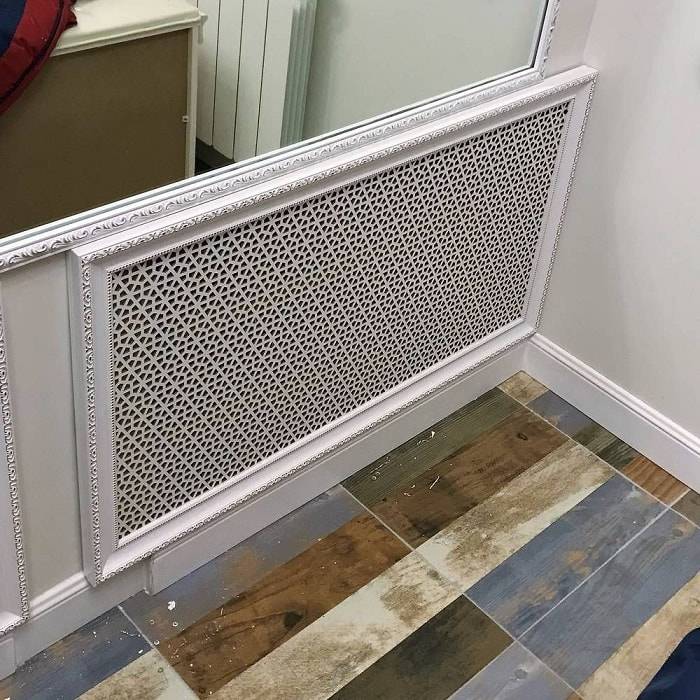 Même si vous avez besoin de grilles pour radiateurs pour la décoration, n'oubliez pas que les batteries doivent chauffer la pièce. Tout écran réduit le transfert de chaleur, même le plus ajouré et le plus fin. Une autre question est que l'un réduira la quantité de chaleur transférée de 10 à 15% et l'autre de 60% ou même plus. Il est peu probable que vous souhaitiez vous asseoir dans une pièce belle mais froide. Par conséquent, lors du choix d'un treillis décoratif, vous devez également tenir compte de la propagation de la chaleur.