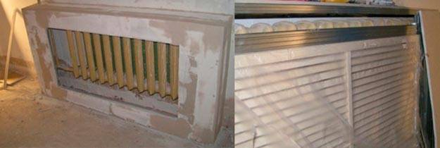 Un écran en plastique avec des trous pour la pénétration de la chaleur est installé dans le plan avant de la boîte. Avant même l'installation des cloisons sèches, sa partie intérieure est fixée sur un cadre métallique. Une fois la boîte complètement prête, sa partie extérieure est insérée dans le trou de l'écran.