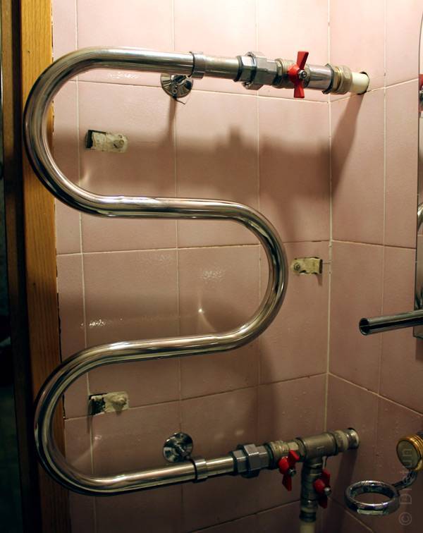 - Connectez le porte-serviettes chauffant au-dessus de la salle de bain à la canalisation en soudant ou en utilisant des fils et des robinets. La deuxième méthode n'est pas recommandée si vous avez l'intention d'utiliser une finition décorative. Parce que cette connexion est étanche. Le porte-serviettes chauffant dans la salle de bain doit contenir un robinet Mayevsky à travers lequel l'air descend.