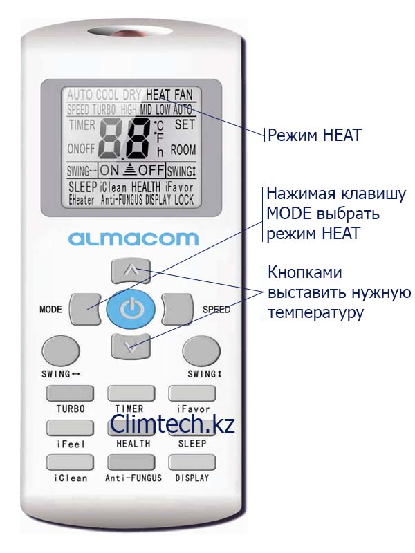 Il doit y avoir une touche "MODE" sur la télécommande. Il peut être situé sous le couvercle. Si vous l'avez toujours trouvé, cliquez dessus jusqu'à ce que vous voyiez l'icône "soleil" ou l'inscription "HEAT".