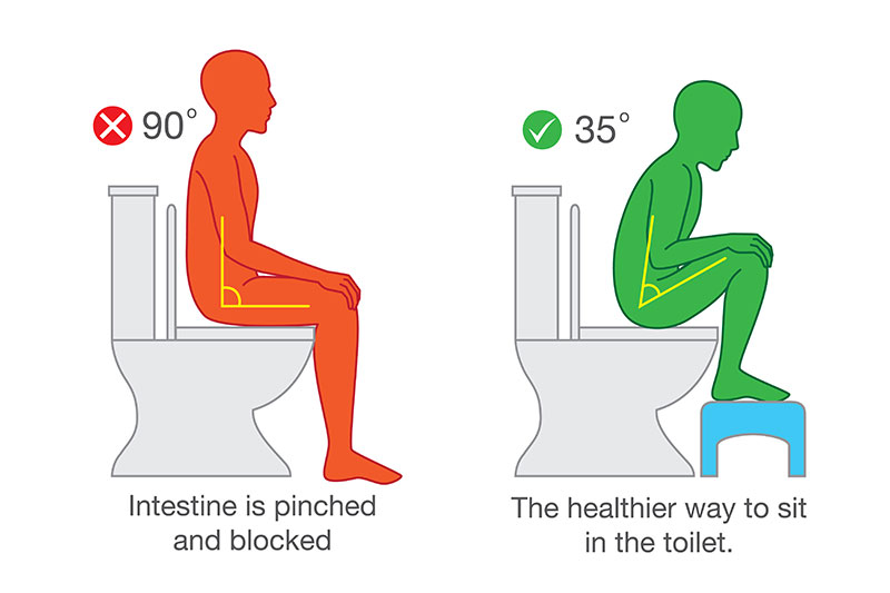 Le fait est que lorsque nous sommes assis avec nos jambes pliées à 90 degrés, le passage naturel des selles est obstrué et bloqué. Par conséquent, nous devons souvent faire des efforts inutiles, ce qui entraîne la constipation, le syndrome du côlon irritable et d'autres problèmes.