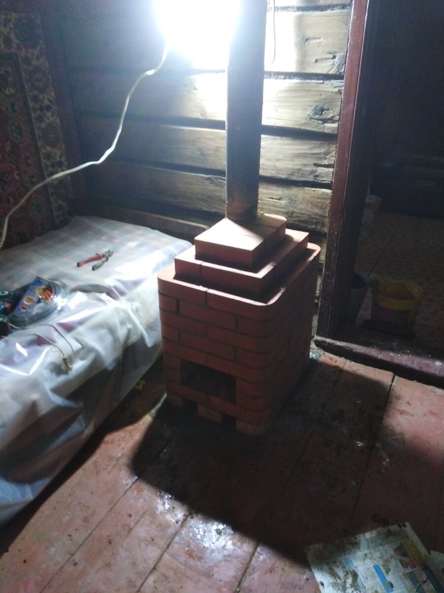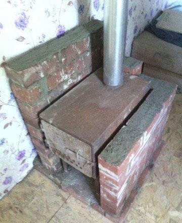• Ensuite, nous mettons une cheminée dans le quadrilatère, que nous joignons à une cheminée en métal. Le tuyau doit être strictement vertical et ne pas dévier sur le côté. Pour une plus grande stabilité, il doit être recouvert de trois rangées de briques.