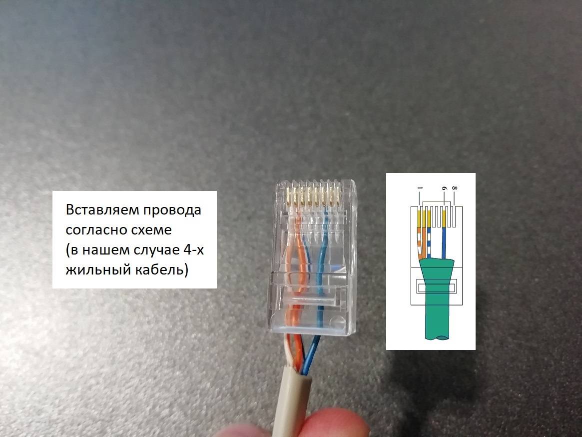 Chaque conducteur doit entrer dans une voie spéciale. Insérez les fils jusqu'au bout - ils doivent atteindre le bord du connecteur. En tenant le câble par le bord du connecteur, insérez-le dans la pince. Les poignées de la pince sont réunies en douceur. Si le corps est devenu normal, aucun effort particulier n'est requis. Si vous pensez que cela "ne fonctionne pas", vérifiez si le RJ45 est correctement inséré dans la prise. Si tout va bien, réessayez.