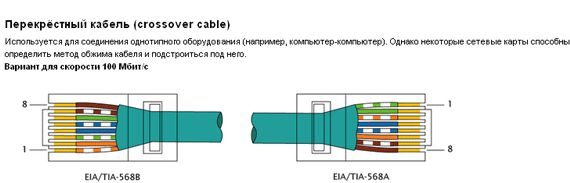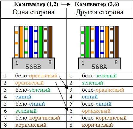 Voici à quoi devrait ressembler le fil après avoir coupé l'excès d'isolation et coupé soigneusement les extrémités des paires (cela doit être fait pour faciliter l'insertion des noyaux dans les contacts du connecteur). - Ensuite, vous devez déterminer le schéma de sertissage. Il peut être droit (les deux extrémités du fil sont connectées aux connecteurs de la même manière) ou croisée (croisement, les deux extrémités ont des positions différentes des paires dans le connecteur). Le type direct est utilisé si vous devez connecter un périphérique à un commutateur - par exemple, un ordinateur portable ou un ordinateur, une imprimante, un téléviseur avec un routeur ou un concentrateur. Un crossover est utilisé pour connecter deux appareils - par exemple, un ordinateur portable avec un ordinateur de bureau.