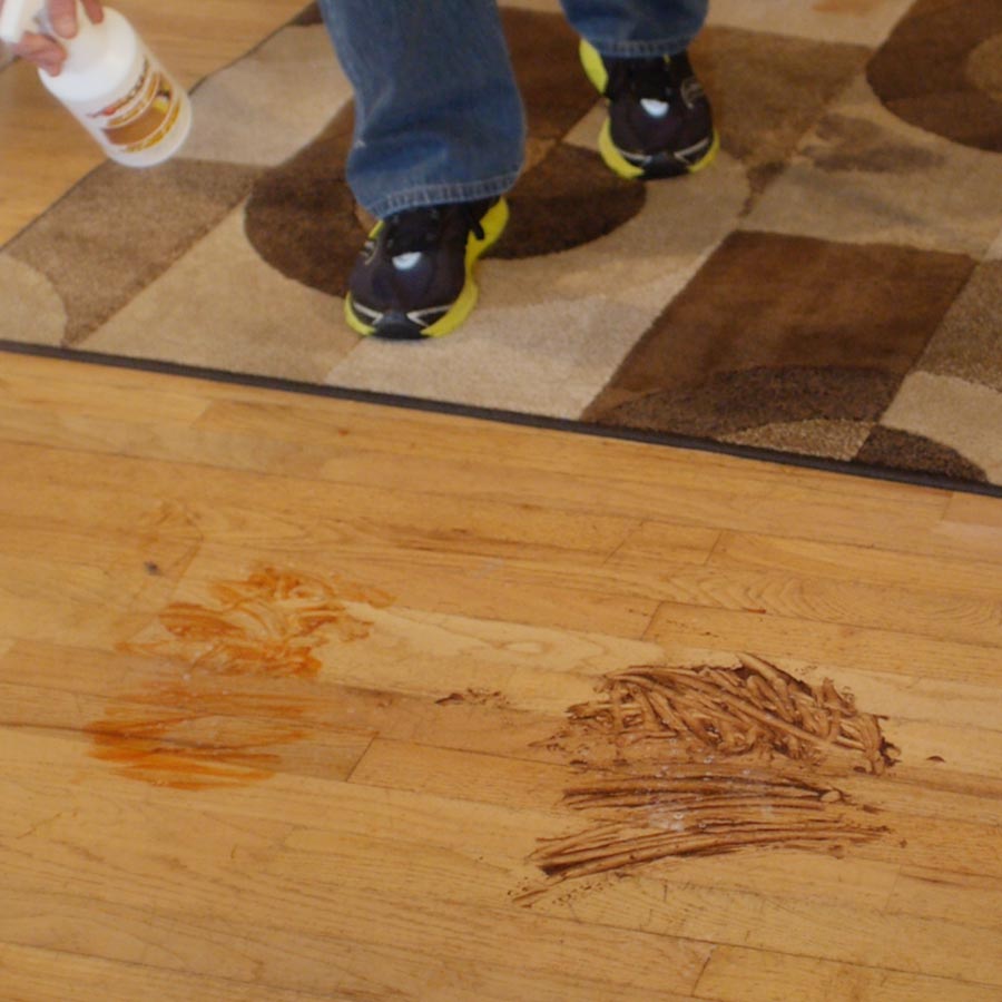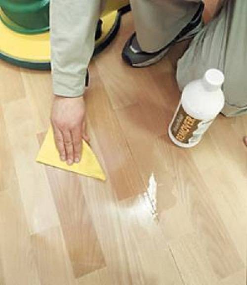 Lors de l'élimination de l'urine, il est nécessaire d'éliminer non seulement la tache, mais également de se débarrasser de l'odeur. L'urine s'écoule dans les joints entre les éléments du parquet, les flaques d'eau doivent être essuyées immédiatement afin que le bois ne soit pas trempé. Le chiffon est humidifié avec une solution d'alcool et le sol est essuyé. Pour se débarrasser de l'odeur, le chiffon imbibé d'alcool est laissé sur le sol jusqu'à ce qu'il sèche.