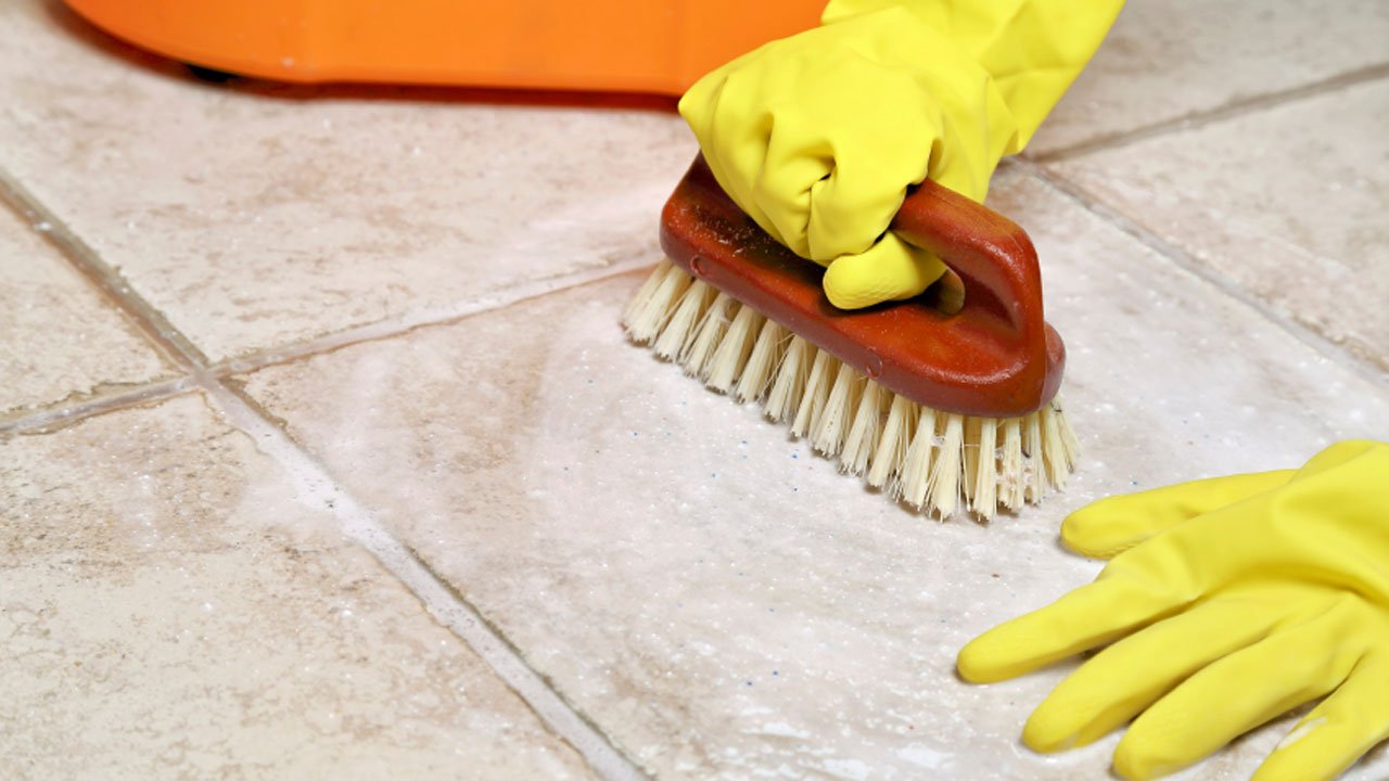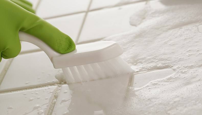 - Prenez une brosse douce et frottez les carreaux avec la solution.