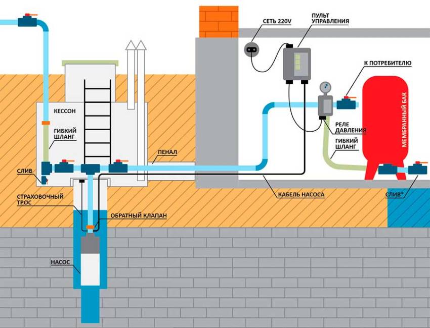 Schéma de raccordement de l'alimentation en eau du puits à la maison et à l'intérieur.