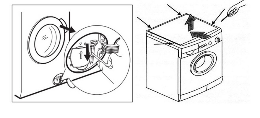 Cependant, certains modèles ne sont pas équipés de tels câbles. Dans ce cas, vous devrez retirer manuellement le panneau supérieur de la laveuse et l'incliner pour atteindre le mur avant. Il a un loquet spécial qui déverrouille la porte fermée.
