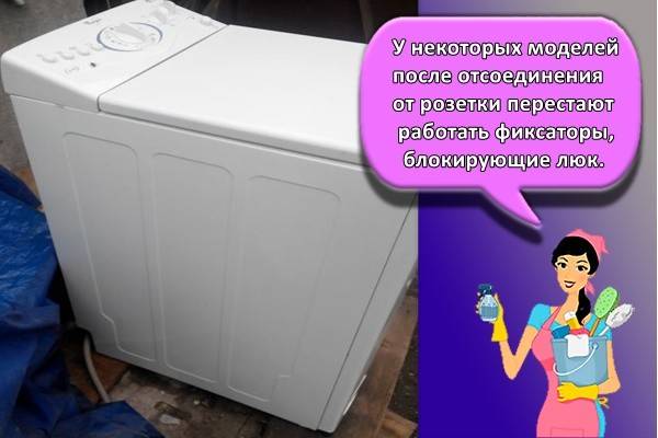 Parfois, pour déverrouiller les portes des machines verticales, il suffit de débrancher le câble d'alimentation de l'appareil de la prise. Pour certains modèles, après déconnexion de la prise, les loquets qui bloquent le toit ouvrant cessent de fonctionner.