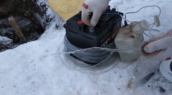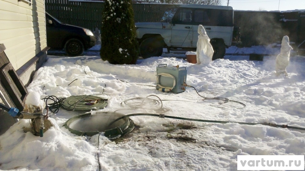 - Lorsque l'équipement est allumé, l'unité fournira de l'eau chaude au pipeline. Avec lui, vous devez pousser le câble plus profondément, à mesure que la glace dégèle.