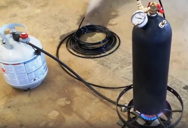 - De l'eau est versée dans le réservoir du générateur de vapeur et un tuyau de petite section (inférieure au diamètre du tuyau d'eau) y est connecté.