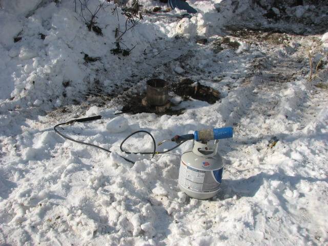 La méthode la plus simple de chauffage des conduites d'eau dans le sol. C'est bien si le propriétaire de la maison a identifié une zone de formation de glace. Dans ce cas, vous pouvez essayer d'enlever la couche supérieure de terre avec un pied-de-biche et une pelle. Du bois de chauffage est posé au point supposé de glace et un feu est allumé. Vous devez brûler le feu pendant au moins 2 heures. Cela devrait être fait pendant la journée afin d'avoir, bien que faible, mais le soutien du soleil d'hiver. Les charbons fumants peuvent être recouverts de feuilles d'ardoise pour conserver au maximum la chaleur. Le feu de joie allumé avant cela devrait réchauffer le sol et le pipeline.