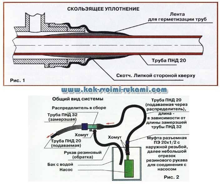 Cette méthode de dégivrage est bonne si un bouchon de glace s'est formé dans une zone située près de l'entrée du tuyau. Si le tuyau est gelé loin de chez lui et qu'il y a des virages et des coudes dans la section du pipeline, le tuyau ne peut pas être poussé dans le pipeline.