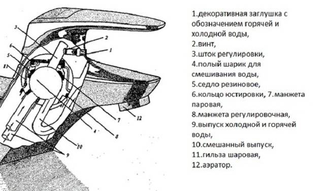 Il tire son nom de l'élément dans lequel l'eau est mélangée - une boule avec des cavités.La balle est généralement en métal, creuse à l'intérieur. Sa partie extérieure est polie pour un éclat. Il y a trois trous dans la boule - deux pour l'entrée d'eau froide et chaude, un pour la sortie d'eau déjà mélangée. Une tige est attachée à la balle, qui pénètre dans la cavité de la poignée. Cette canne à bille fixée rigidement modifie la température de l'eau, sa pression.