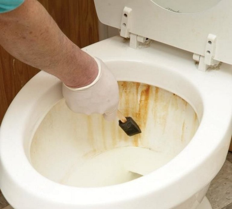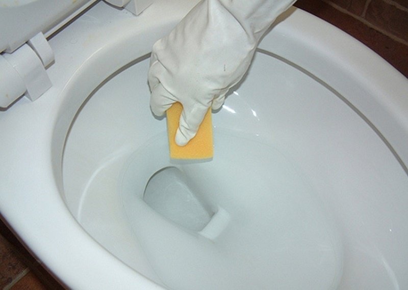 Pour nettoyer les toilettes de la pierre urinaire, de la rouille, de l'acide est appliqué sur une éponge ou un chiffon humide, et après cela - aux zones à problèmes. Il ne reste plus qu'à les frotter avec une brosse et rincer à l'eau.