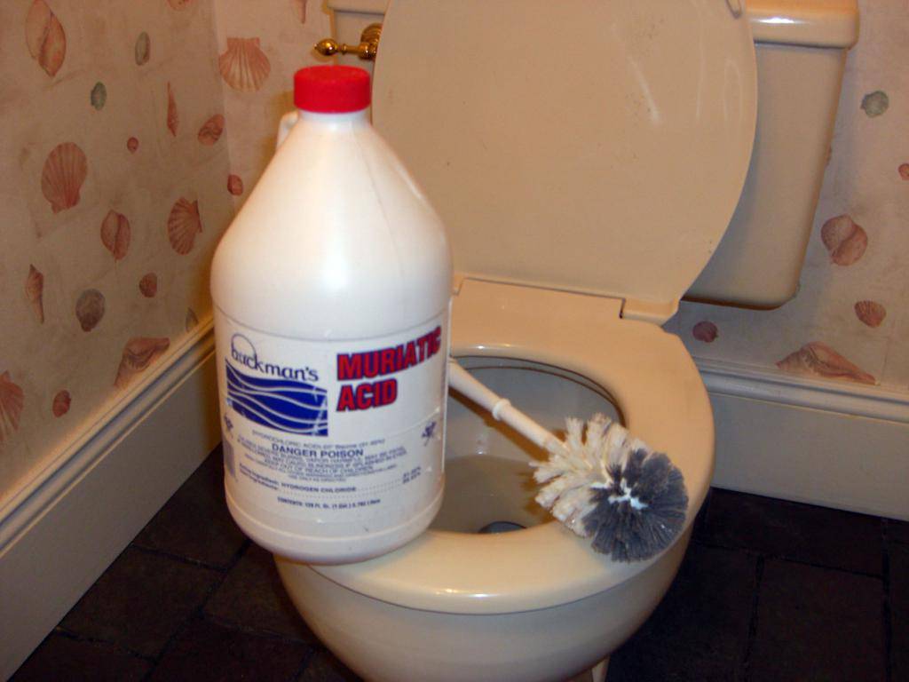 Lors de l'utilisation de ce remède, veillez à respecter les règles de sécurité afin de ne pas endommager la peau et les poumons ! Arrosez la cuvette des toilettes avec de l'acide chlorhydrique, frottez-la avec une brosse et fermez le couvercle. Après 15-20 minutes, frottez à nouveau la saleté et lavez l'acide. Ne pas utiliser le produit si le drain est constitué de tuyaux en plastique.