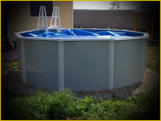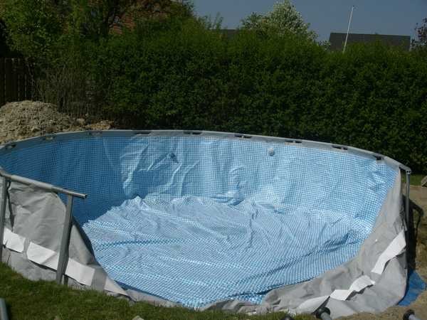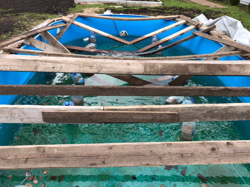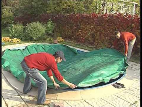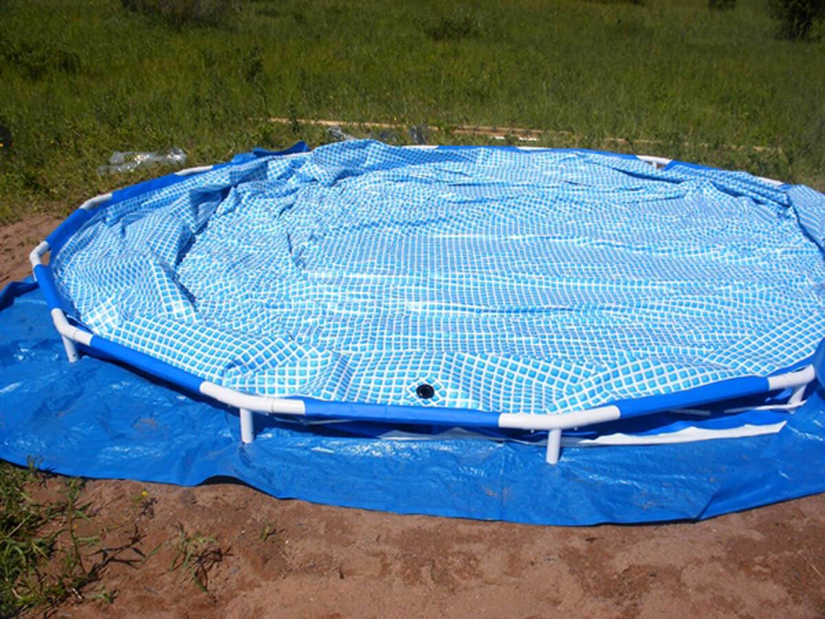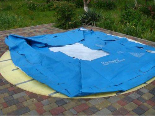6. Enfin, assurez-vous de fermer la piscine avec une bâche de protection. Si l'écran en plastique fourni avec les piscines préfabriquées doit être utilisé, il doit être surélevé au centre afin que les sédiments ne s'accumulent pas à l'intérieur. Cela peut être fait à l'aide d'un flotteur à coussin gonflé ou d'un pneu de voiture ordinaire, qui doit être placé au centre du bol.