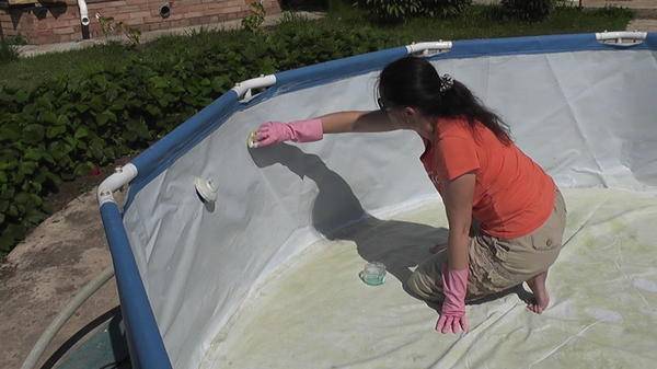 2. Avant de vidanger l'eau, nettoyez soigneusement les parois du réservoir. Pour faciliter et accélérer ce processus, vous pouvez pré-remplir l'eau avec un détergent qui ramollira la plaque. Cependant, les piscines doivent être manipulées avec soin, en choisissant soigneusement les produits chimiques afin que le liquide corrosif n'endommage pas le film et les parties métalliques.