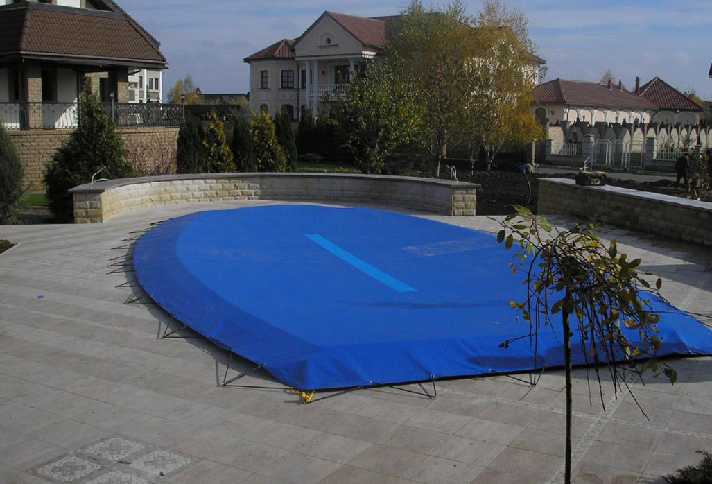 Beaucoup stockent la couverture de piscine pliée juste à l'endroit de son installation. La protection contre l'influence des facteurs externes est un film de polyéthylène dense pressé au sol avec des briques. Cela se fait avec de grands conteneurs difficiles à transporter ou qui prennent tellement de place qu'ils ne rentrent tout simplement pas dans la grange. Cela ne veut pas dire que c'est la bonne décision, mais de cette façon, le plastique est protégé du soulèvement du sol et de la pression de l'eau gelée.