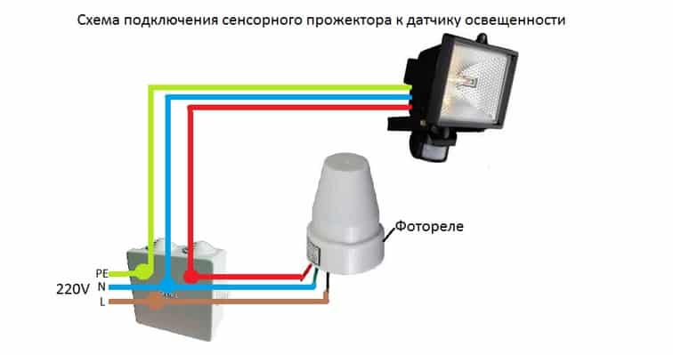 - Schéma de connexion d'un projecteur à un relais photoélectrique et à un capteur de mouvement