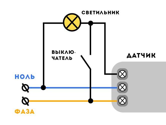 À condition que, en plus du capteur, il soit nécessaire de connecter des appareils supplémentaires, tels qu'une minuterie ou un détecteur de mouvement, ils se trouvent dans le réseau de connexion après la cellule photoélectrique. Dans ce cas, l'ordre d'installation de la minuterie ou du détecteur de mouvement n'a pas d'importance.