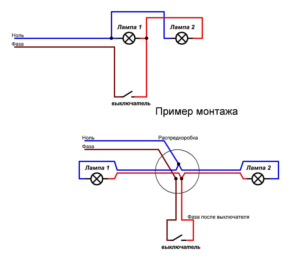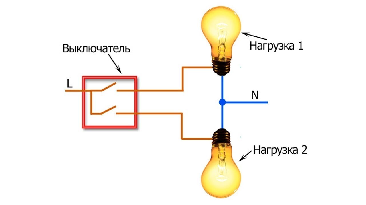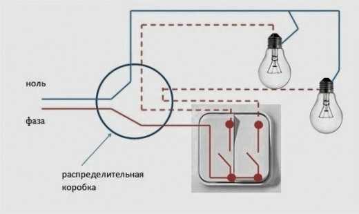 La seule différence est qu'au lieu d'un lustre, deux ampoules sont utilisées, qui sont connectées en parallèle. De la même manière, le schéma de connexion d'un interrupteur à deux gangs est organisé.