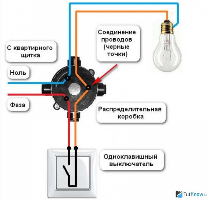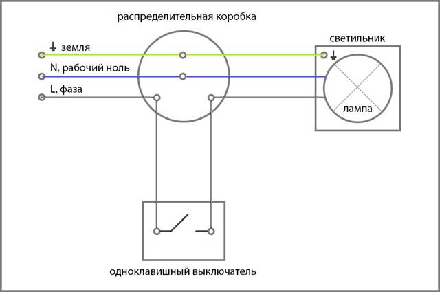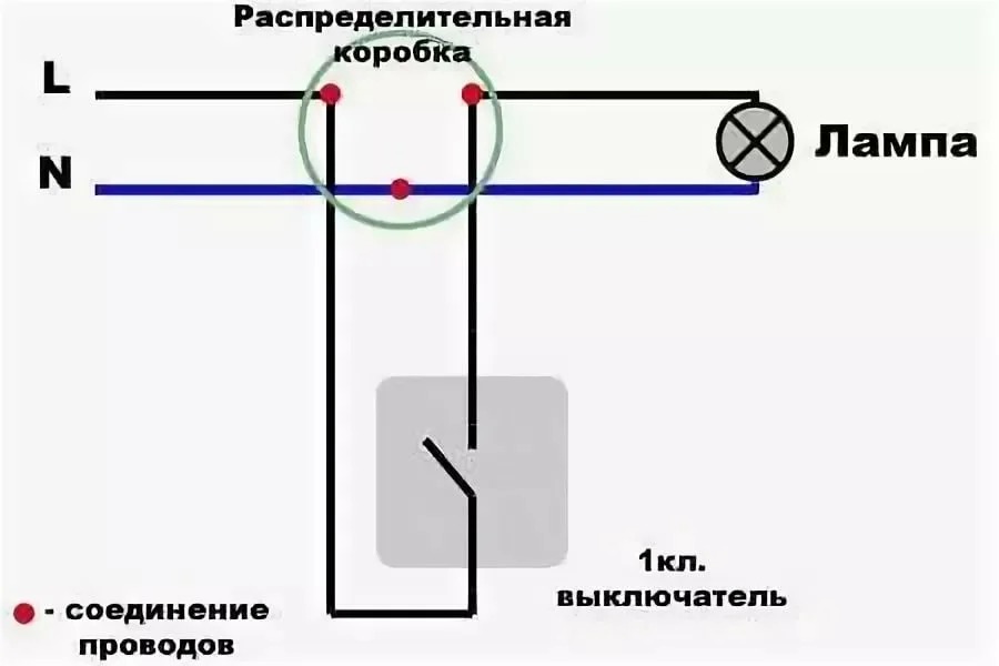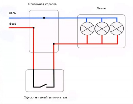 Assurez-vous de le lire, un article très utile. En conséquence, nous obtenons la connexion des conducteurs de travail de la lampe et le câblage général via l'interrupteur. Ensuite, il reste à tout connecter correctement.