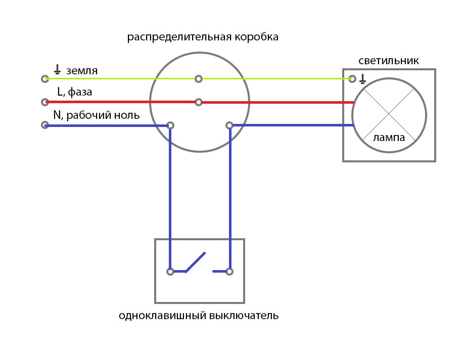 Le principe général de connexion des interrupteurs dans la plupart des cas est le même: l'interrupteur sert à couper la phase sur la ligne et le zéro est effectué directement sur la lampe. Pourquoi phase et pas zéro ? Cette exigence est expressément indiquée dans le PUE, qui stipule que la possibilité de couper un conducteur neutre sans déconnecter la phase doit être exclue. Ceci est directement lié aux mesures de sécurité dans le fonctionnement des dispositifs d'éclairage. Lorsque l'appareil est débranché du secteur à l'aide de l'interrupteur, il ne doit pas être mis sous tension afin de pouvoir le réparer en toute sécurité ou de changer la lampe.